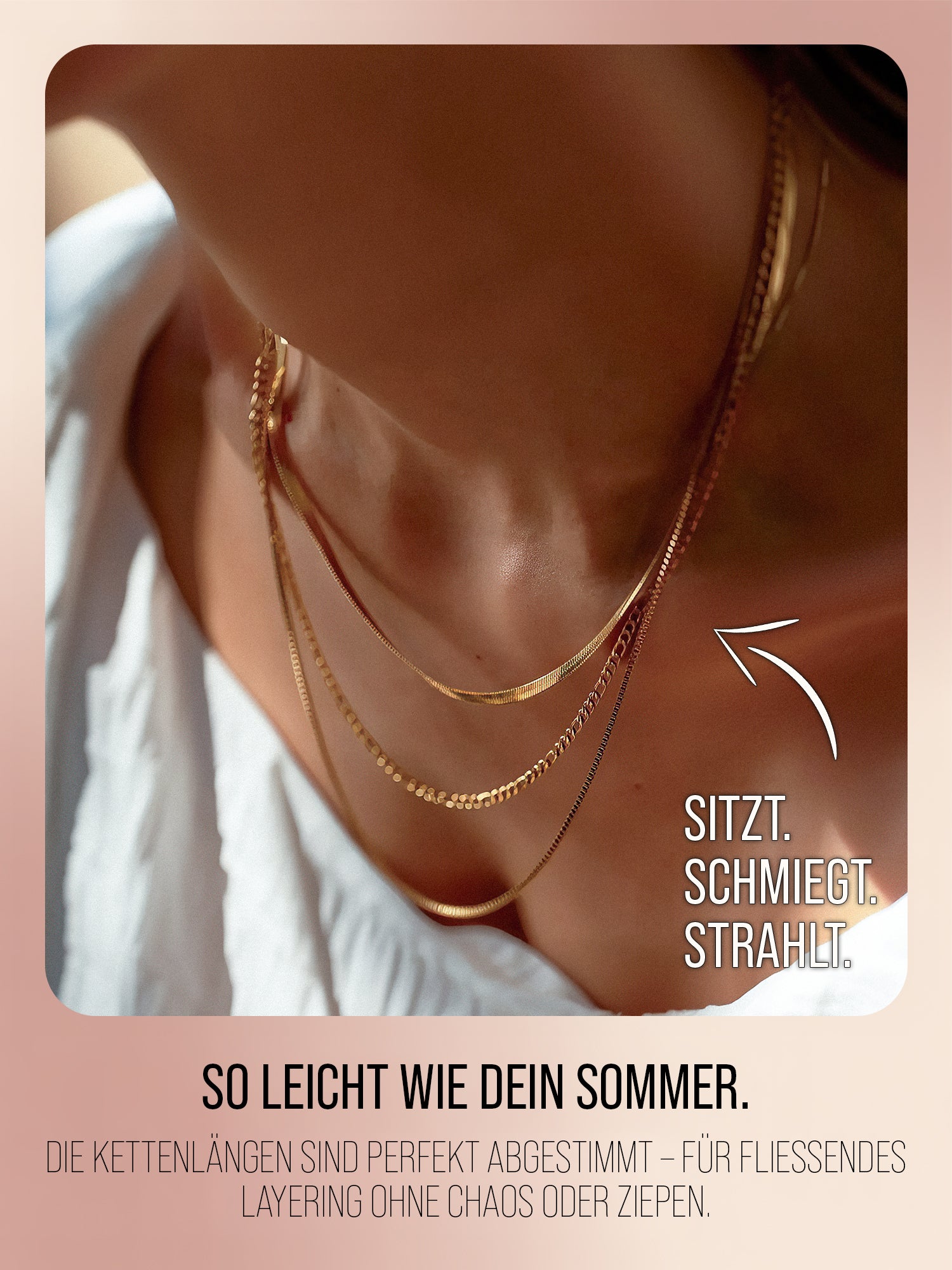 • DEIN SCHMUCKSTÜCK VOLLER SOMMERLAUNE: Die "Layers of Maui" ist mehr als eine Kette – sie ist ein Gefühl. Drei harmonisch abgestimmte Ketten (Schlangen-, Figaro- und Venezianerkette) vereinen sich zu einem stilvollen Statement, das an tropische Brisen, warme Sonnenstrahlen und das entspannte Lebensgefühl Mauis erinnert. Dein täglicher Begleiter mit Fernweh-Flair!