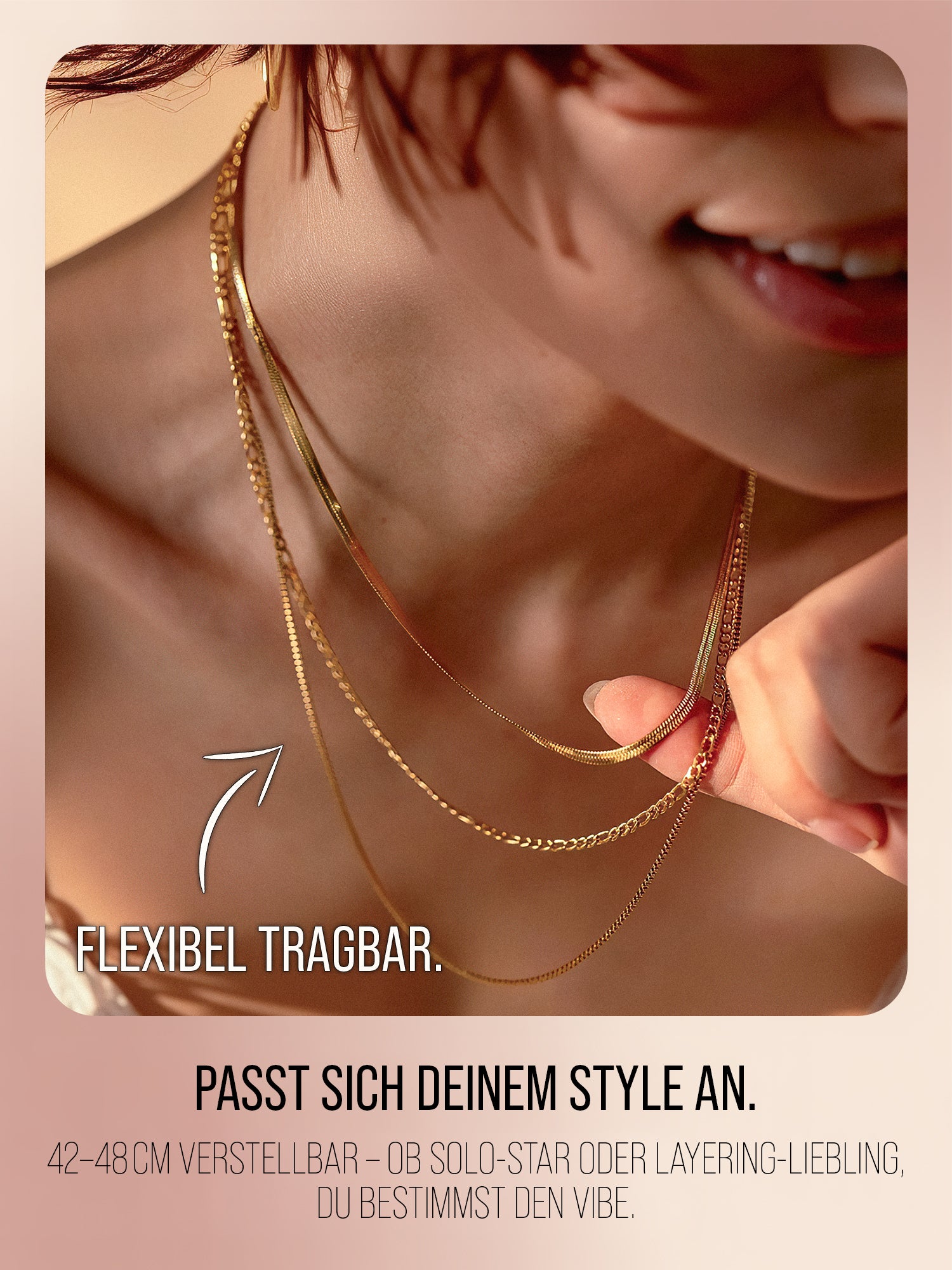 • DREI LAGEN, UNENDLICHE MÖGLICHKEITEN: Die stufenlos verstellbare Länge (42–48 cm) macht das Layering zum Kinderspiel. Die zarte Schlangenkette legt sich sanft an deinen Hals, die Figaro-Kette bringt Struktur, während die filigrane Venezianerkette deinem Look feine Raffinesse verleiht. So wird dein Stil mit jeder Bewegung lebendig.