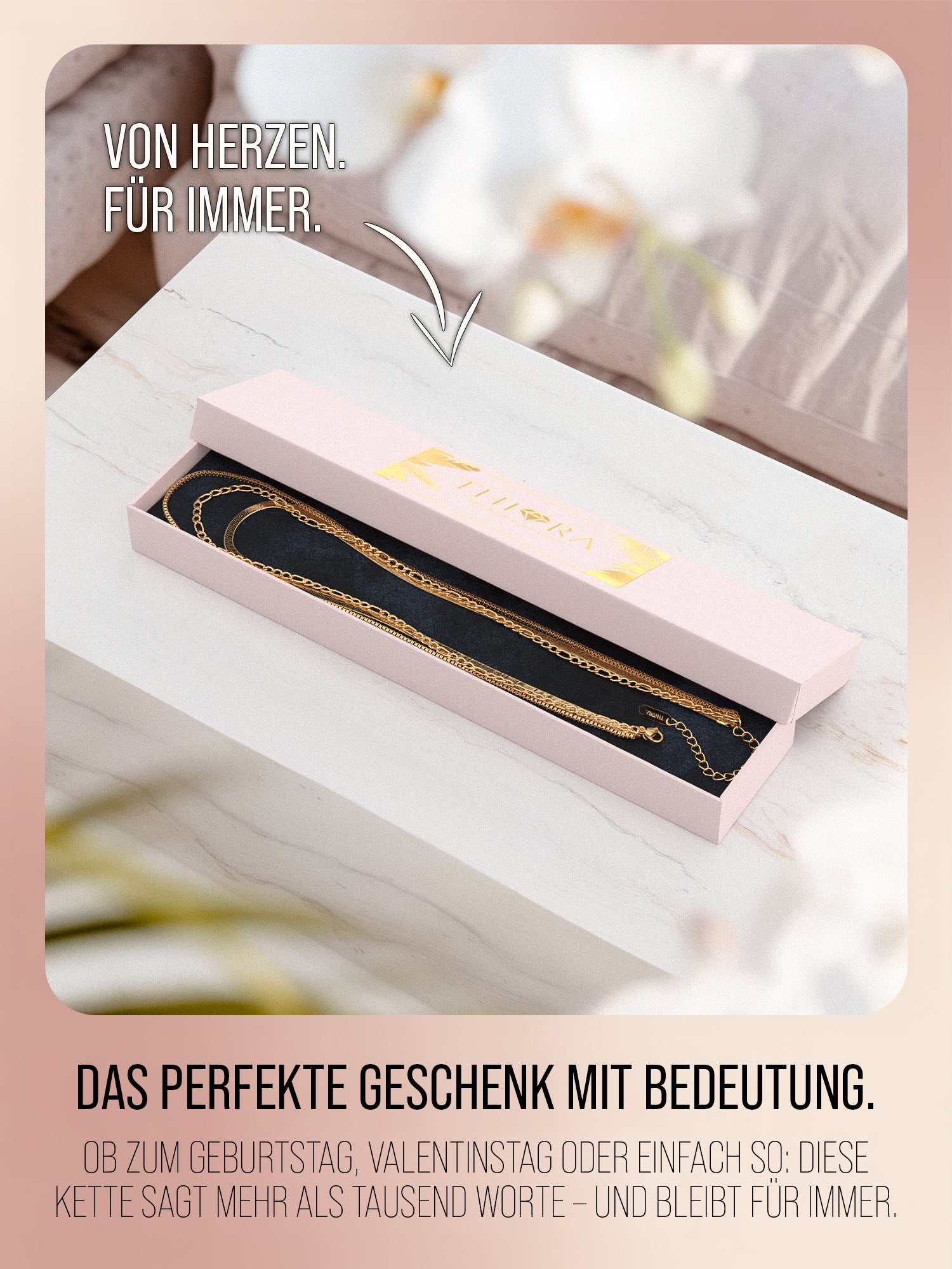 • HANDWERK MIT HERZ – IN EDELSTAHL GEGLIEDERT: Gefertigt aus hochwertigem 316L Edelstahl, ist die Kette robust, hautfreundlich und 100% wasserfest. Ob mit strahlender 18kt Gold-, Roségold- oder Silberveredelung – jede Variante sorgt für langanhaltenden Glanz und maximale Alltagstauglichkeit. Dank des cleveren Verschlusses sitzt die Kette mühelos und komfortabel.
