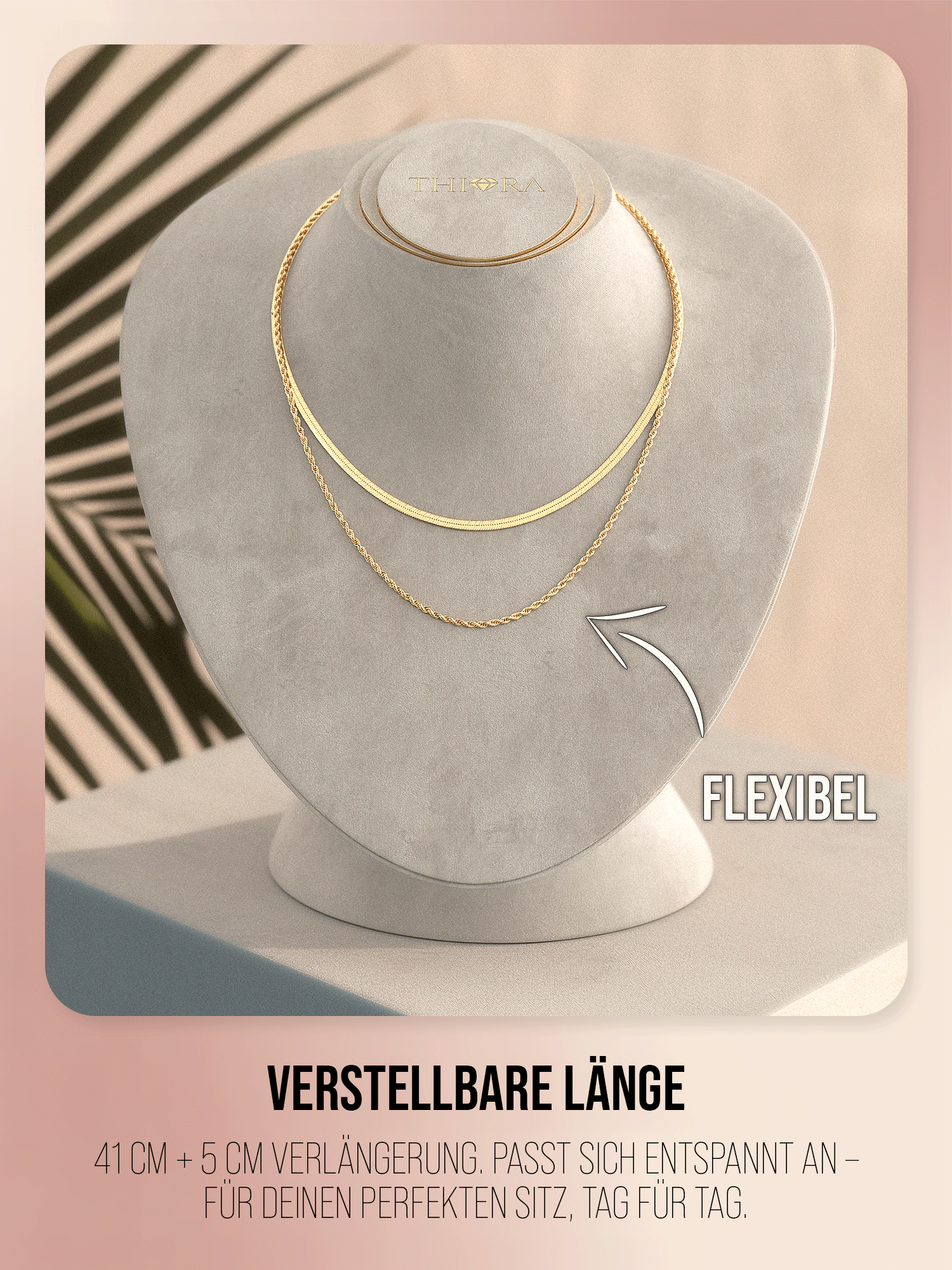 ZWEI KETTEN, EIN FLIEßENDER LOOK: Die THIORA „Twin Waves“ vereint eine elegante Schlangenkette mit einer fein gedrehten Kordelkette – ein harmonisches Duo, das wie zwei sanfte Wellen über dein Dekolleté gleitet. Minimalistisch, modern und perfekt abgestimmt für einen cleanen Layering-Look.