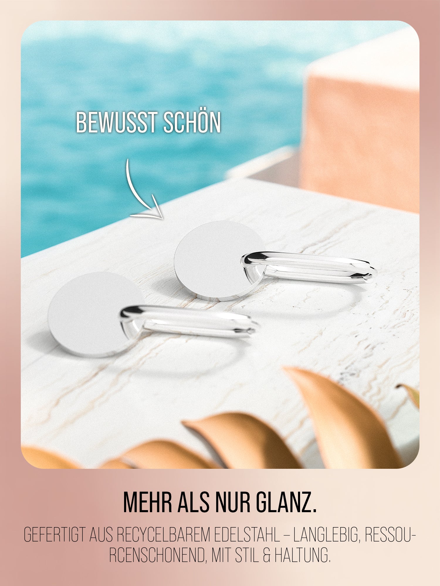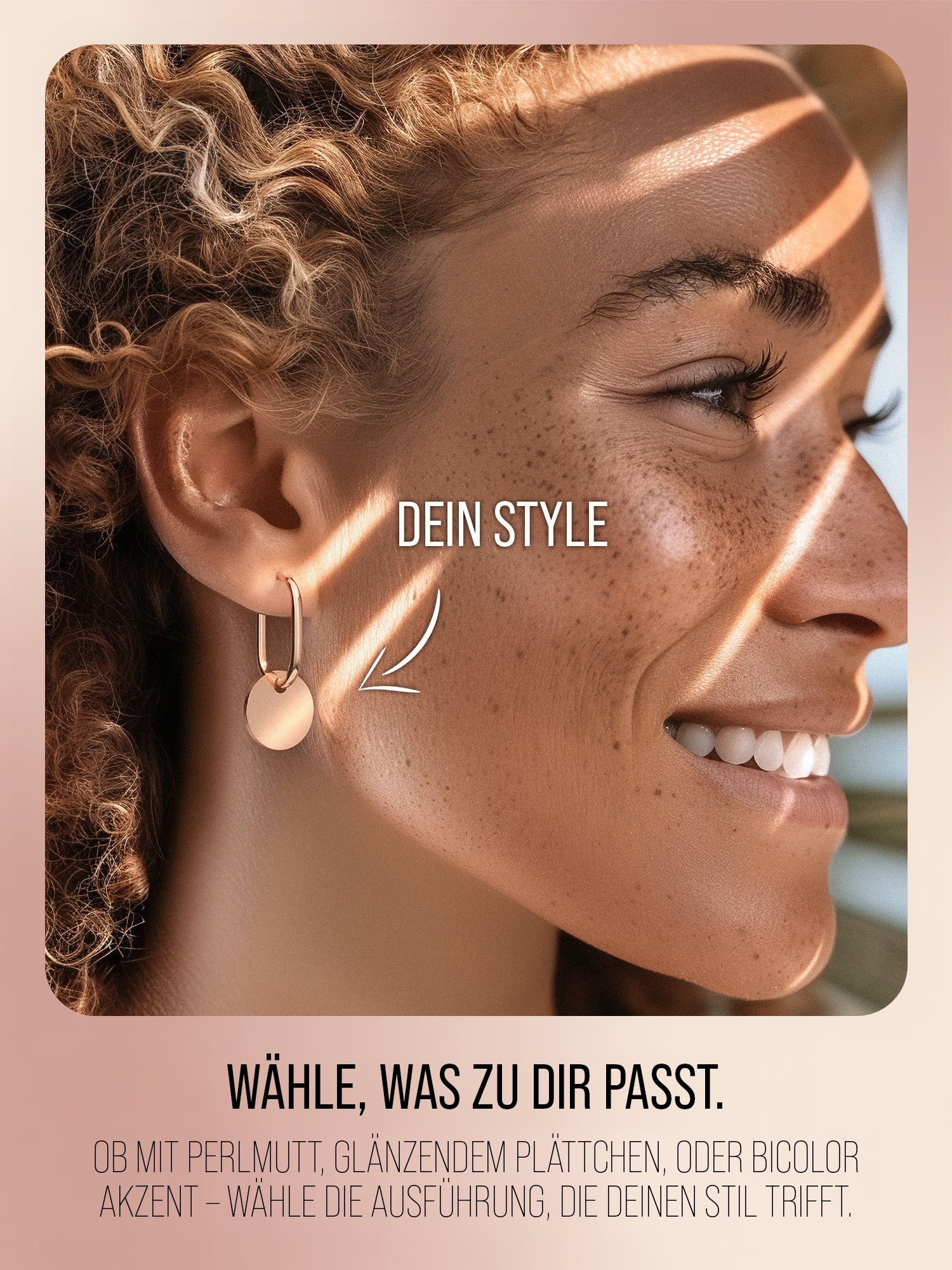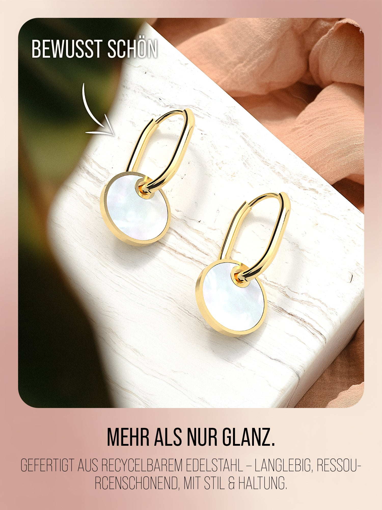 Das wahre Highlight ist jedoch der Perlmutt-Anhänger. Jedes Perlmutt-Plättchen ist einzigartig und reflektiert das Licht auf seine ganz eigene Weise, genau wie du. Unsere Pearl Oasis Creolen sind nicht nur ein Accessoire, sondern ein Statement.